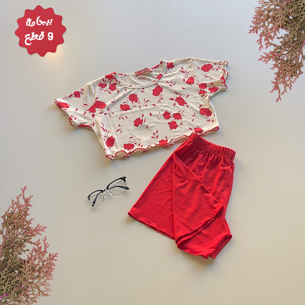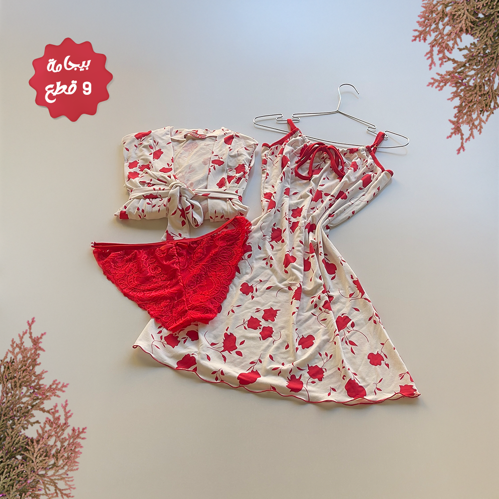 • طقم بيجامة 9 قطع بتصميم ورود جذاب.